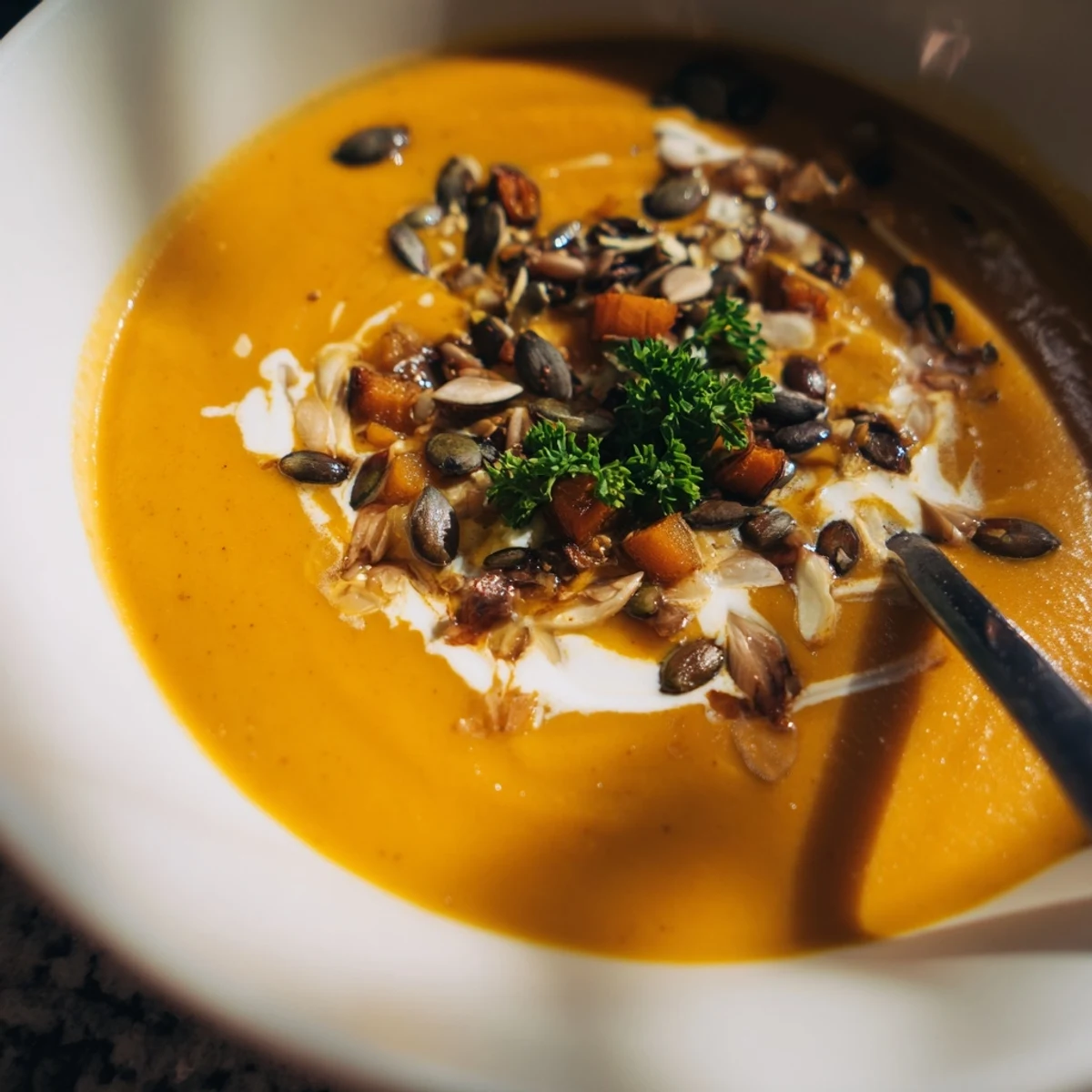 - Garnitur (optional): Geröstete Kürbiskerne, frische Petersilie oder Schnittlauch, gehackt, Schuss Sahne oder Kokosmilch